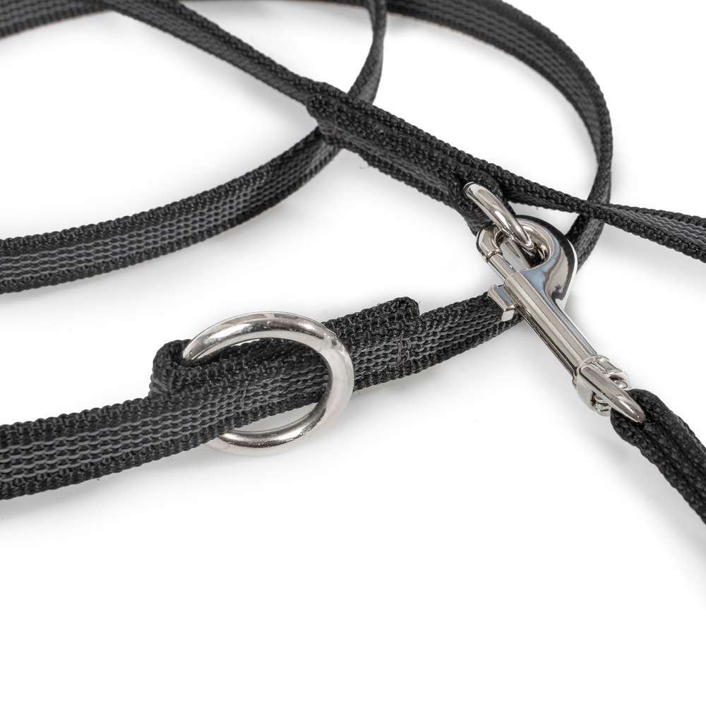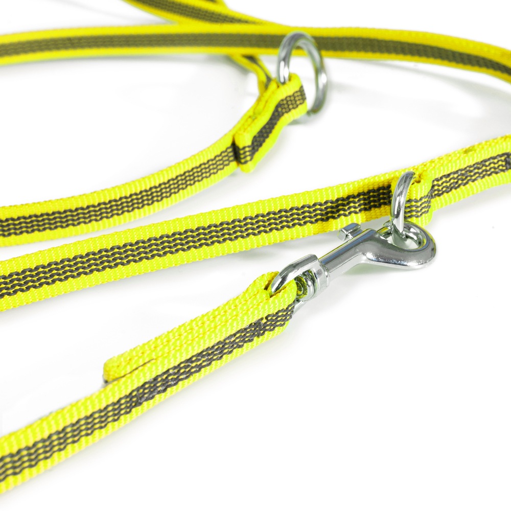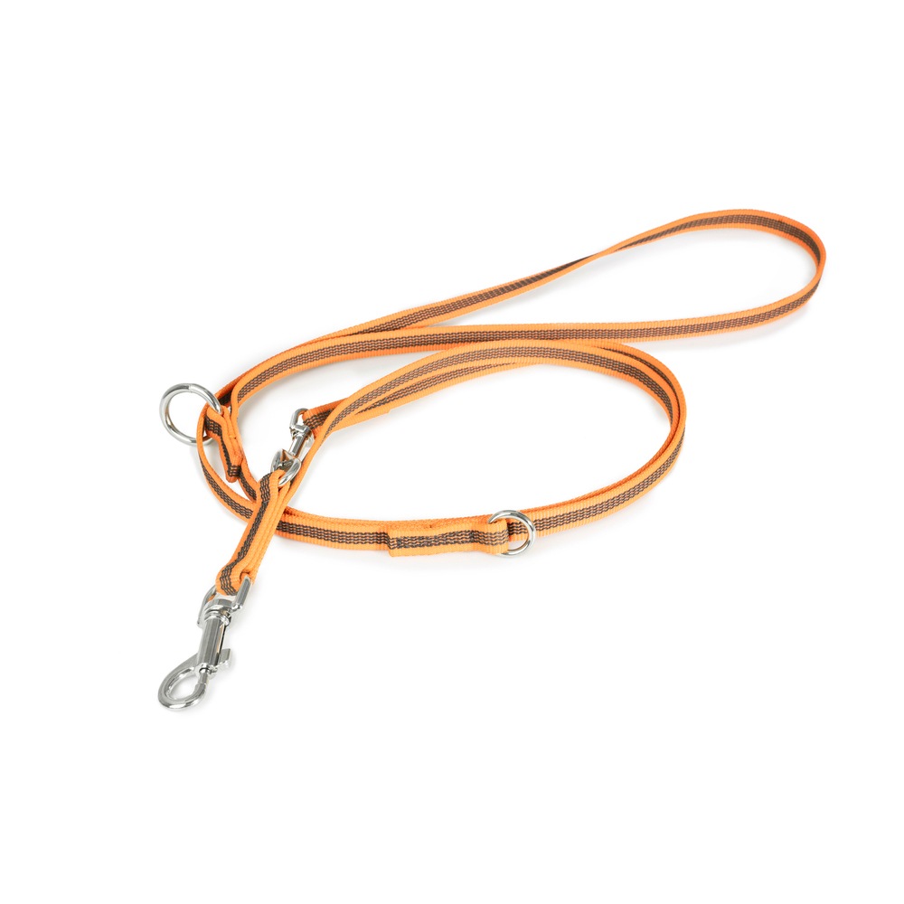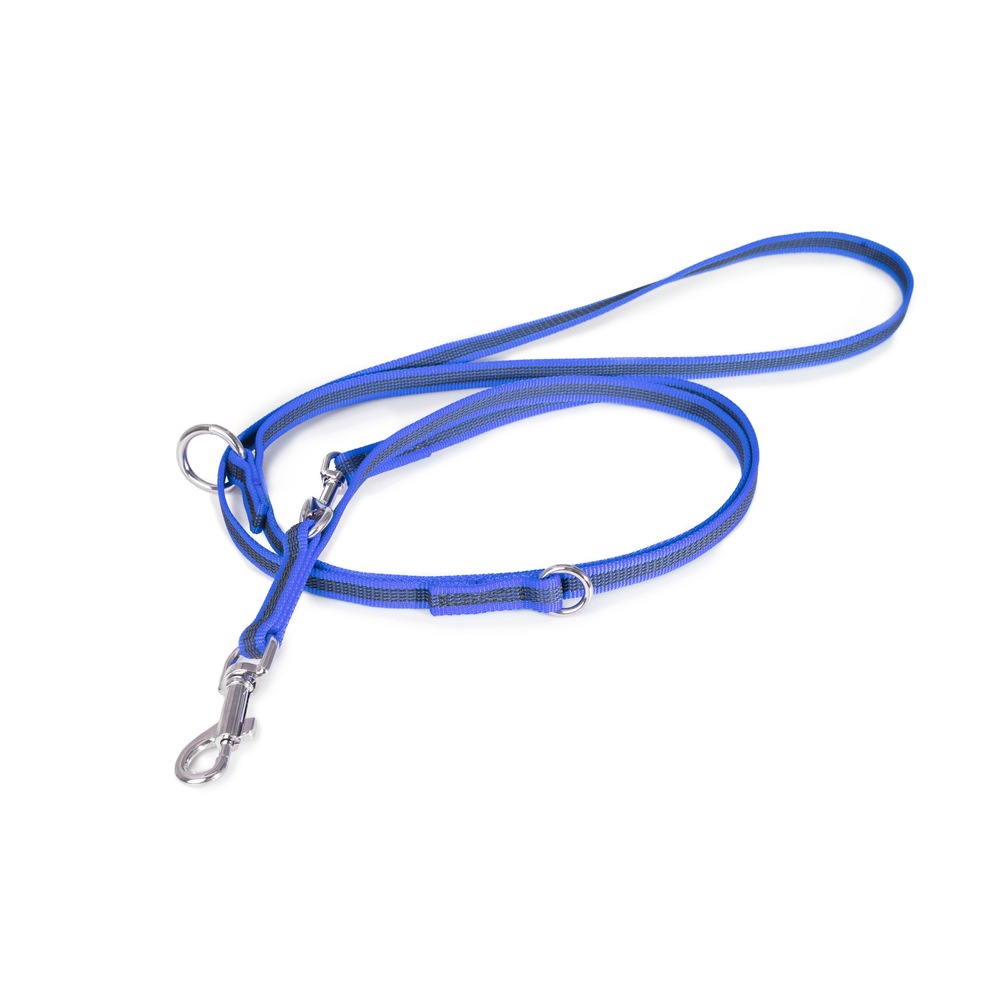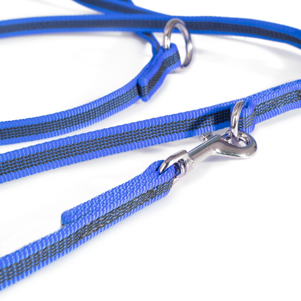 | 2つのナスカンと長さ調節機能により、短いリードと長いリードの両方の利点を兼ね備えています。 最も短い状態で長さ1.2mですが、完全に解放するとその倍の2.4mになります。 また、片方のナスカンをハーネスに、もう片方を首輪に装着するのに適しているので、臆病な犬を誘導したり、ハーネスに慣れさせたりするのにとても役に立ちます。 このリードは同時に2頭まで誘導することができ、その場合、1頭につき1.2mがリード部分の長さとなります。 |